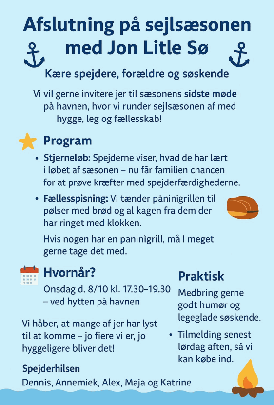 Vi vil gerne inviterere spejdere, forældre og søskende til sæsonen sidste møde på havnen, hvor vi runder sejlsæsonen af med hygge, leg og fællesskab