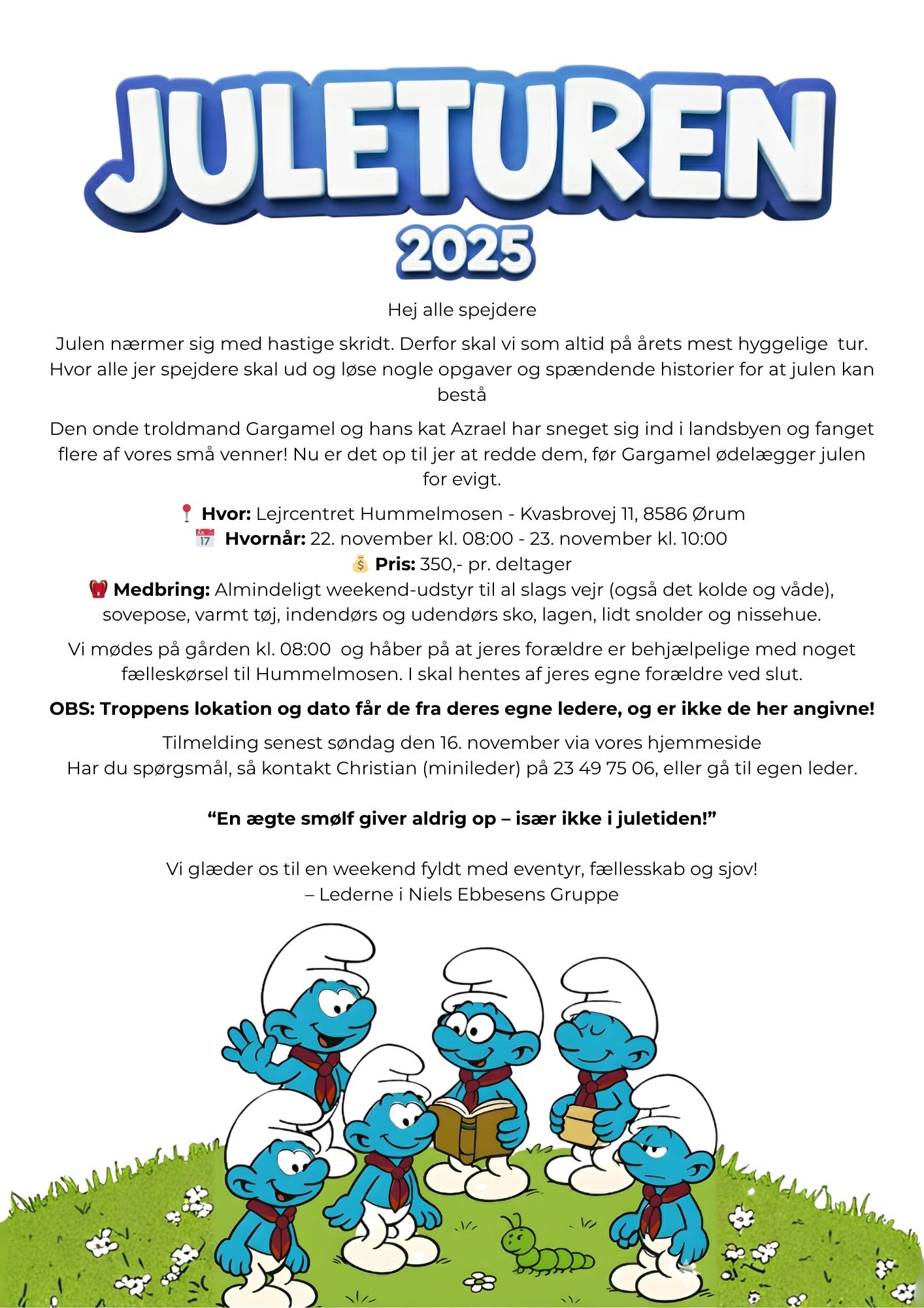 I må meget gerne gå ind på hjemmesiden og tilmelde jer ledertilmelding, så vi ved hvor mange der skal købes mad til, og hvor mange hænder der er i løbet af weekenden. Også selvom I kun kommer noget af weekenden, vil vi rigtig gerne have I tilmelder jer. https://www.nielsebbesensgruppe.dk/begivenhed/juleturen-2025